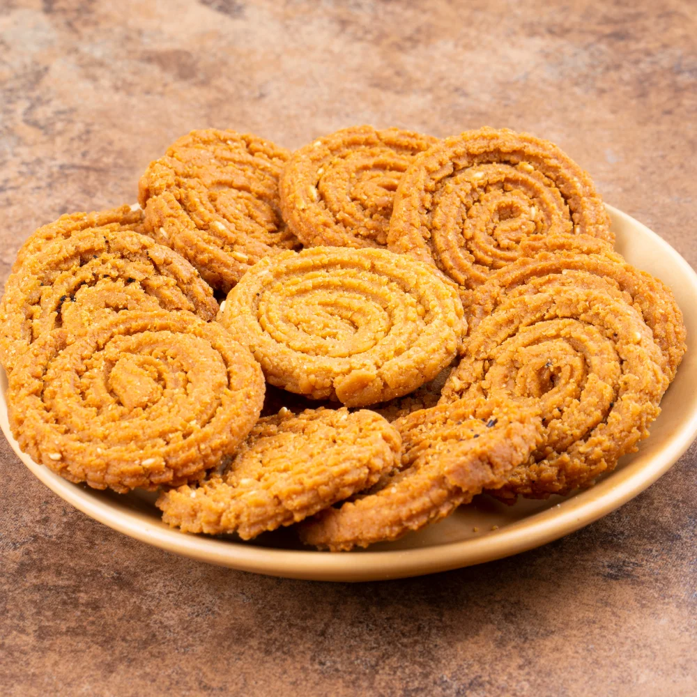 Bhajani Chakli are crispy, spiral snacks made from all-purpose flour, blended with a mix of roasted grains and spices for a unique flavor. These savory treats offer a delightful crunch and a nutty taste, making them perfect for snacking. Ideal for enjoying with tea or as a standalone treat, they provide a satisfying bite in every piece. Indulge in the wholesome goodness of these flavorful chaklis!